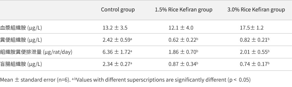 針對高膽固醇大鼠,使用 Rice Kefiran,可以發現能有效降低腸道中組織胺含量,改善腸道環境